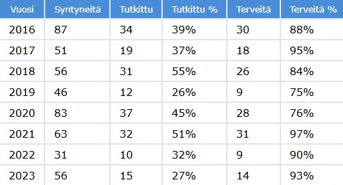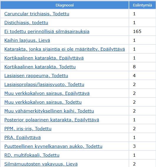 Vieressä Kennelliiton KoiraNet-jalostustietojärjestelmästä haettu tiedot vuosina 2016-2023 syntyneiden silkkien virallisista silmätarkastuksista. (v. 2025 syntyneitä ei ollut vielä tutkittu)