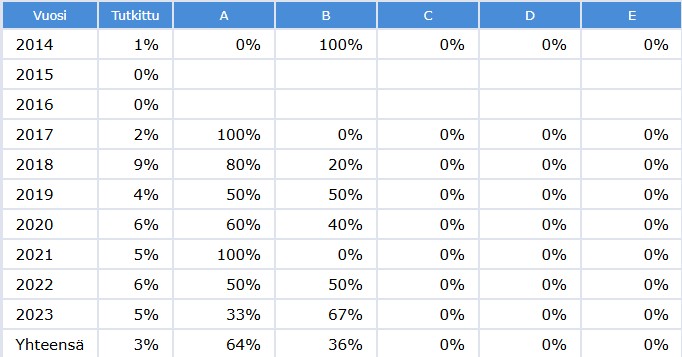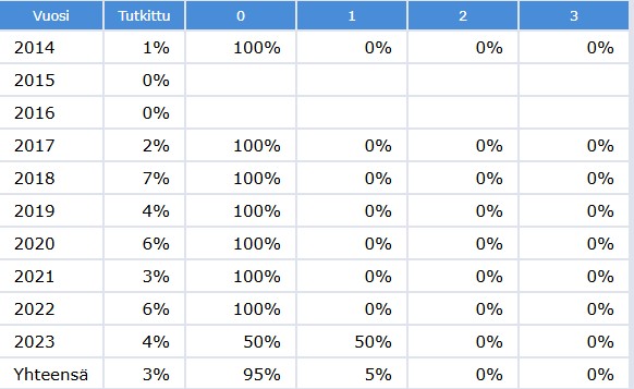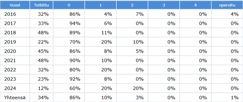 Vieressä Kennelliiton KoiraNet-jalostustietojärjestelmästä haettu tiedot vuosina 2014-2023 syntyneiden silkkien virallisista luustokuvauksista. (v. 2025 syntyneitä ei ollut vielä tutkittu).