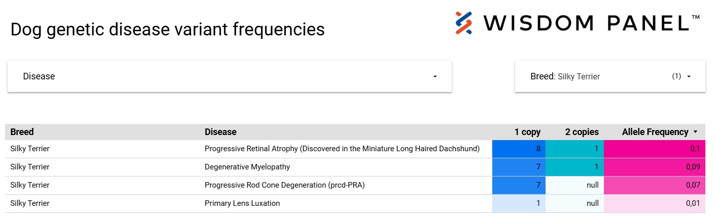 Vieressä Wisdom Panelin MyDogDNA-geenitesteillä havaitut sairaudet silkkiterriereillä. Raporttia ei valitettavasti ole päivitetty hetkeen.